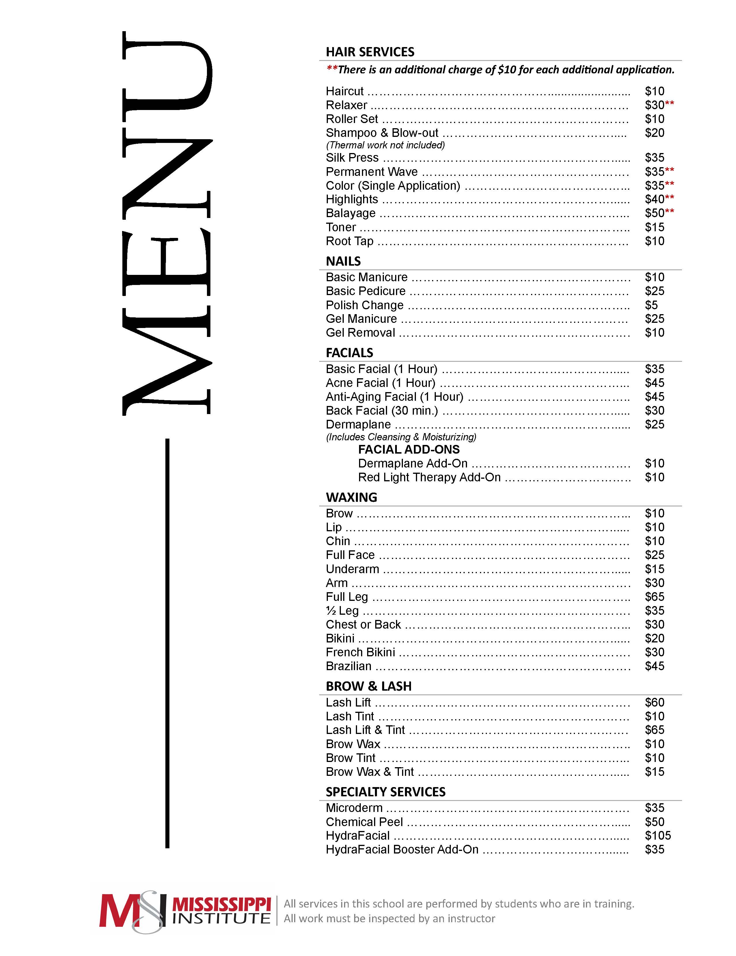 As part of the training we provide to future professionals, hair, nail, skin care services are offered to the public. Because these services are performed by students under the supervision of licensed instructors costs are substantially lower than those that you might find in a professional salon or spa. Below is a list of all the services we offer.